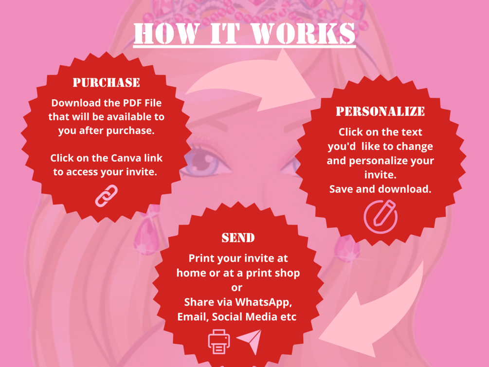 Download the PDF file that will be available to you after purchase and click on the Canva link to access your template or copy paste the link onto your browser. Alternatively, you can click on the link below the PDF file. Click on the text you'd like to change and personalize your invite. Save and download. Print & mail, email, share on WhatsApp or your socials!